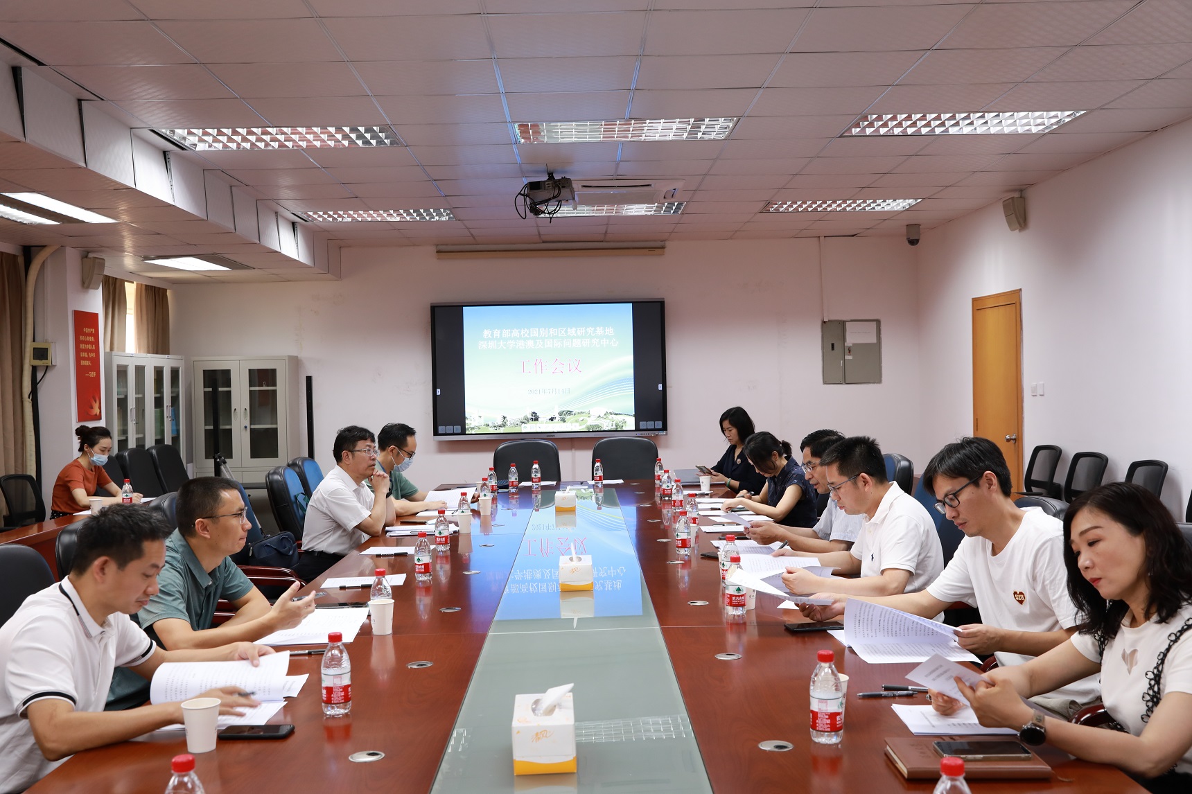 7月14日上午,深圳大学港澳及国际问题研究中心工作会议在汇元楼628会议室召开。这是深圳大学“港澳及国际问题研究中心”获批为教育部国别和区域研究基地后召开的第一次工作会议。会议由社会科学部主任田启波主持,国际交流与合作部主任韩水仙、计划财务部主任杨大鸿、人力资源部副主任黎陨、法学院院长刘俊、外国语学院院长张晓红、社会科学学院教授姜安、港澳基本法研究中心主任邹平学、城市治理研究院副院长谷志军、大湾区国际创新创业研究中心主任牛奔、法学院副院长叶海波、港澳基本法研究中心副主任王千华参加。